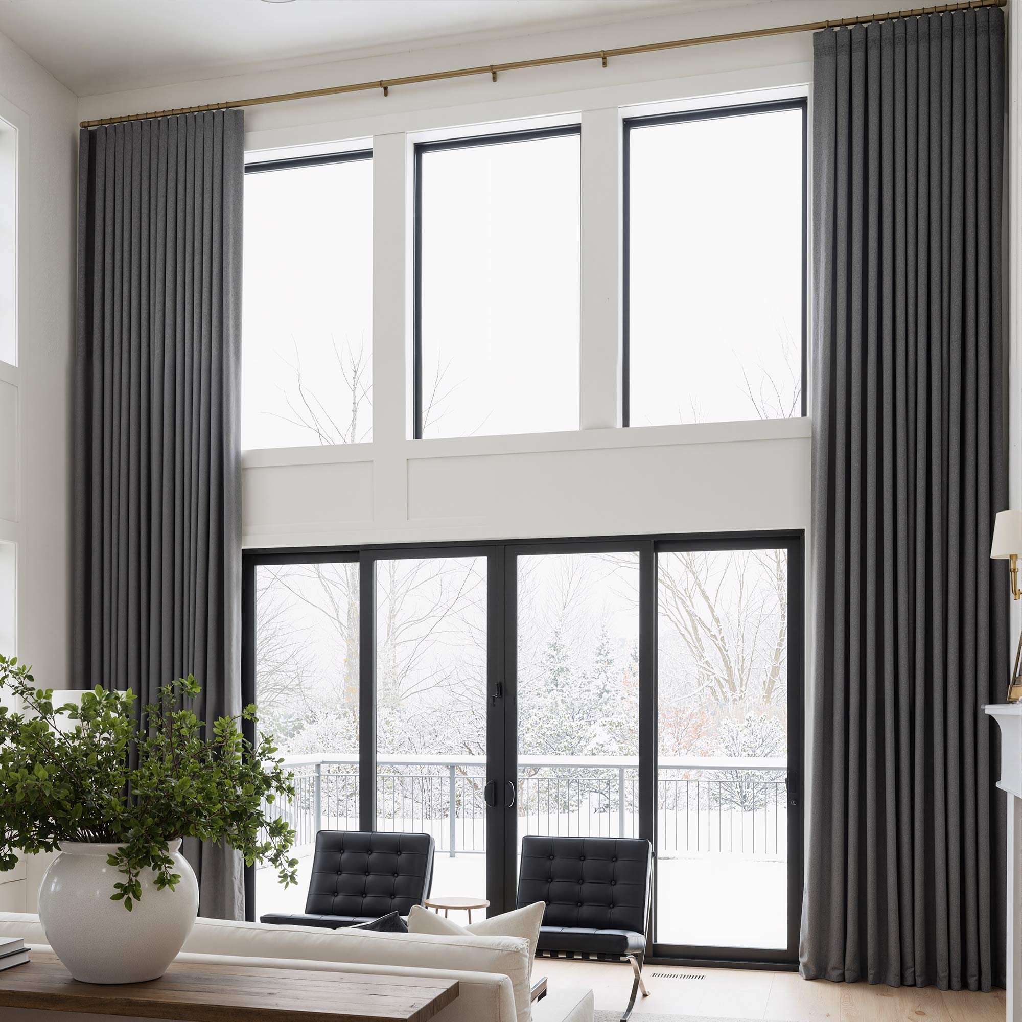 To achieve an automatic curtain system for wide and high areas, pair the pleated header style curtains with the Jason Motorized Track.
