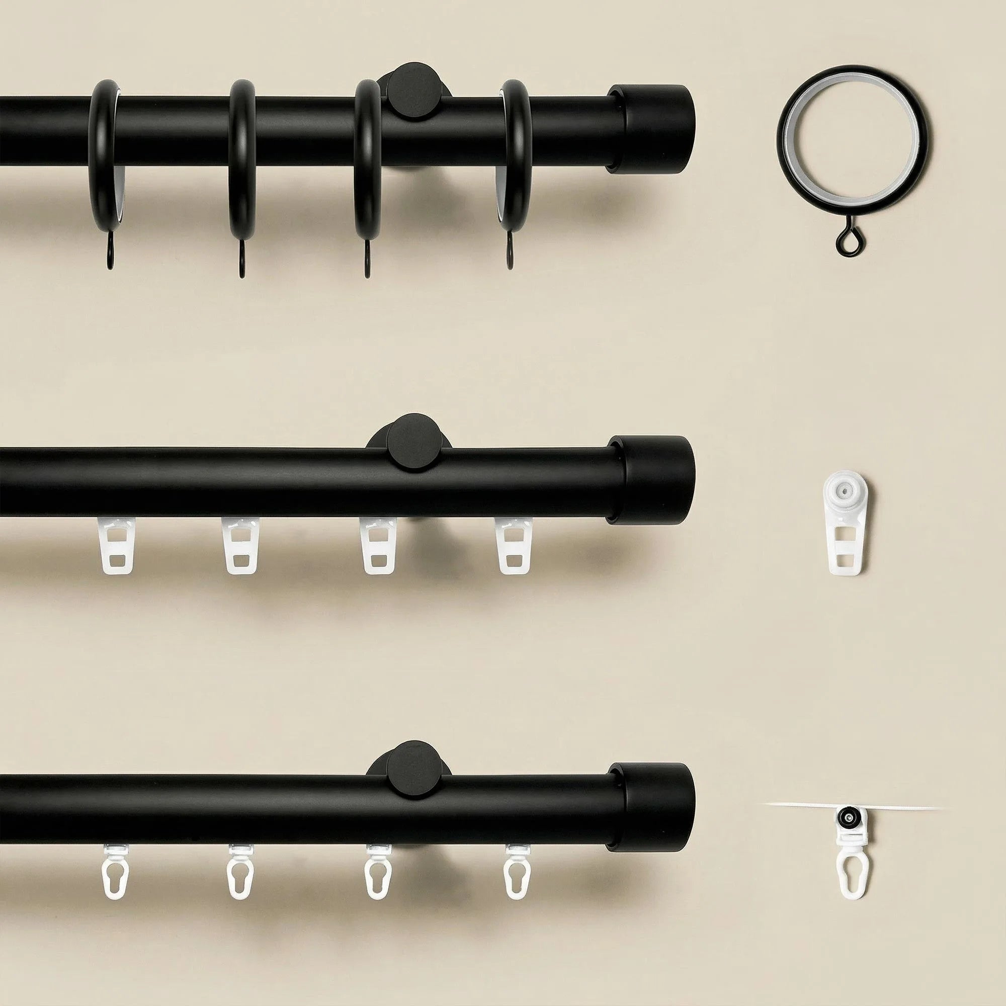 Offer 3 runner options, like REX-rings (per 4 in offer 1 ring), REX-pinch pleat gliders (per 4 in offer 1 runner), and REX-wave gliders (same width as the pole, and runner space is 2.36 in).