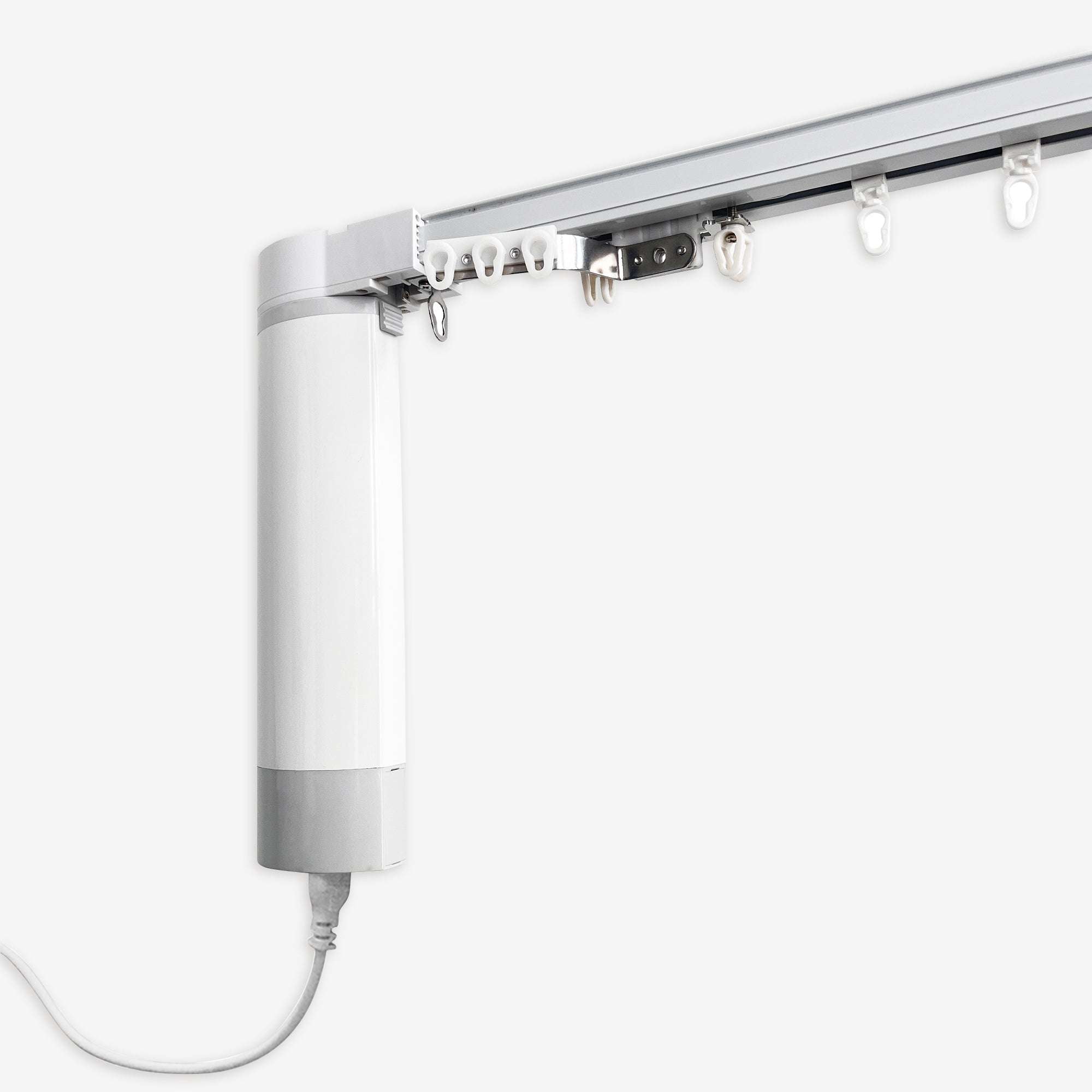 Each track uses a motor with a built-in belt to drive the metal slider to open and close the curtain. Fit pleated header curtains and flat panel header curtains.